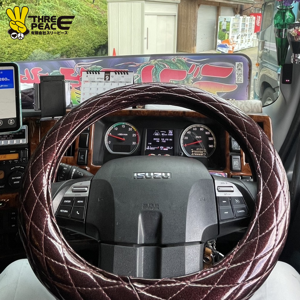 ハンドルカバーは18年前に亡くなった親父が使ってたやつで、今でも走るたびに親父が隣にいるような気持ちになります。ワンマン行燈には、冗談半分で《スナック ゆうか》って嫁の名前を入れてみたり、昔から大事にしてる歌の歌詞《アンタあの娘の何なのさ!?》を入れてたりします。天井にはちょっと遊び心でリンゴ型のシャンデリアを付けて、寝台には「親父に憧れてこの業界に入った」っていう気持ちを込めた《親父の背中に憧れて》のスクリーンを飾ってます。家族のこととか親父のこととか、自分の想いを全部詰め込んだ、俺にとって特別な内装です。